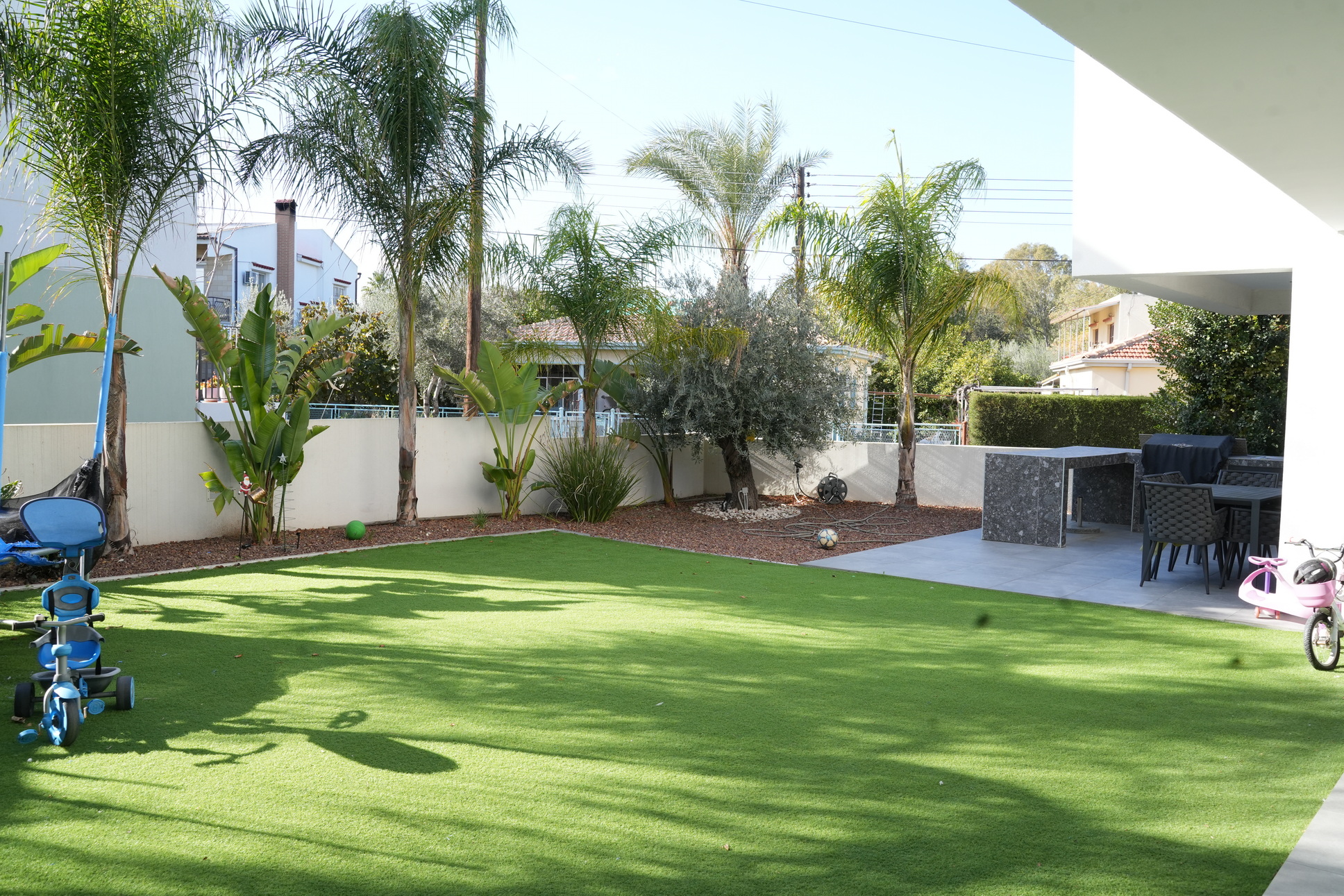 Set within a prime and rapidly developing residential area of Lakatamia, the property further impresses with a spacious landscaped garden with artificial grass, perfect for leisure and family enjoyment, as well as a double garage providing convenience and security.